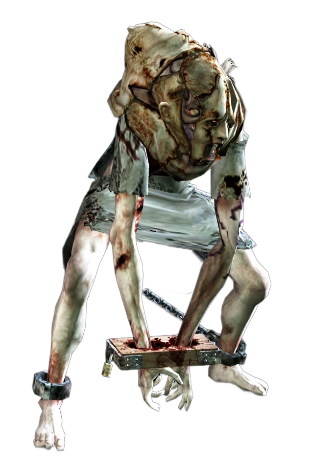 As a result of the ingestion of various types of mutagenic viruses, Lisa's physical constitution was horribly deformed. Lisa's disgusting face is partially covered by the face of her mother who died at the hands of Lisa as she believed she was someone else so she killed her by removing her face and sewing it to her to find her mother and return it to her. One of his mysterious yellow mutant eyes can be seen through one of the holes in his mother's face sewn into her face. In some versions of the game it is possible to see their teeth. Its hump and the long extension of its arms give it an appearance similar to an orangutan. Lisa is wrapped in a tattered light blue hospital gown and her hands are held together by wooden handcuffs, as well as having broken chains on her feet. There is a clearly visible eyeball-shaped tumor on Lisa's back, a typical sign of the G-Virus. It also has tentacles, like the Nemesis T-Type, whose injection was the virus that would make it go down in history in Umbrella.