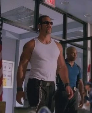 His mere presence is enough to gain everyone's attention as he walks into the police station, sporting a sleeveless shirt that showed off his heavily muscled arms and a unique tattoo on his right arm. The tattoo is that of a heart wrapped in vines, with blood drops falling from the base. Above the tattoo on his shoulder is an eye symbol in the center of a sun structure.