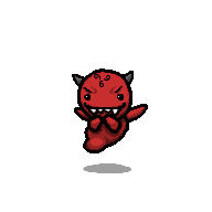 Loki is red demon with his two grey horns and two hands and wings and four spiked teeth, he has also three hairs