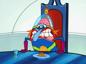 Plankton lets out a speech about his victory with the Atlantean arsenal, and then fires the tank to try and kill SpongeBob, the gang, and the guards, however, he fails because the ammo was actually strawberry ice cream. He jumps out of the tank and kicks it out of frustration, injuring himself.