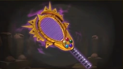 As Lucien, it is a menacing-looking tennis acket that was given a golden frame that has spikes. It has five magic Power Stones just below his "sweet spot". Its handle is a dark purple shade with grayish-white stripes. Its color scheme is a warning not to mess with him.