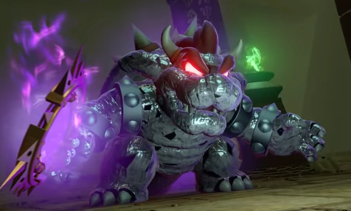 Lucien and Bowser combined to further enhance his power, causing the two to merge into Bowcien. This form retains much of Bowser's normal appearance, but also has Lucien's features. This includes dark gray patterns all over their body and extremely bright red eyes. Overall, Bowcien looks like a golem version of Bowser.