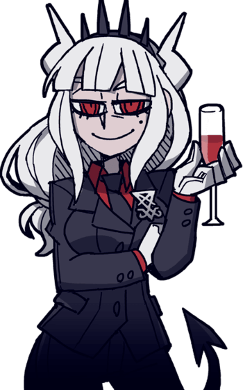 Lucifer herself can be described as a well-endowed and gracefully refined woman, befitting her nature as the de facto leader of Hell. She is a woman with white long hair, red eyes and unlike other demons, she has large white horns and is wearing a black spiked tiara on her head. In addition, she also wears a black businessmen suit with a red shirt and black tie tucked inside of it, and also wears the sigil of Lucifer on the left side of her chest. She is often seen holding a glass filled with wine in her left hand.