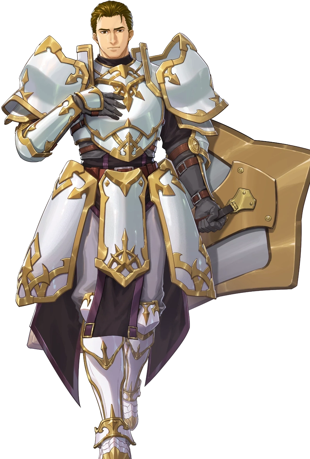 Ludveck is a young man with a broad face, short brown hair, and matching eyes. He is clad in a suit of white armor with gold accents.
