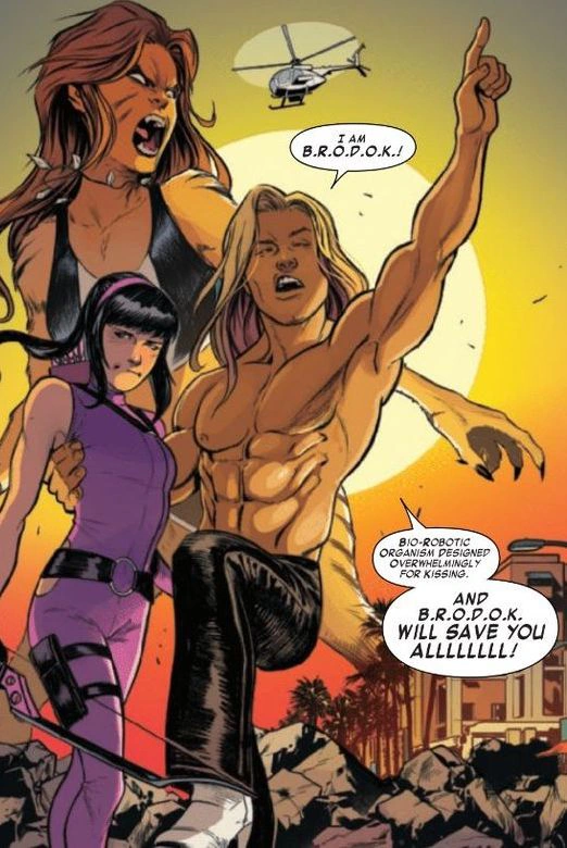 M.O.D.O.K. Superior's next big appearance was now in a muscular, long haired, attractive young human body that he called B.R.O.D.O.K.. He joined the West Coast Avengers and insisted that he was reformed, which turned out to be another one of his schemes. He was really planning to turn the women of the area into giant mindless monsters, as he was rejected by them. The team knew this the whole time, and he was stopped in the end.