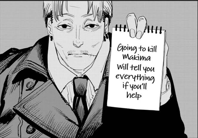 | “ | (Due to the Yakuza's leader refusal to cooperate during their meeting with Makima, she then suddenly pulls out some kind of package) Yakuza Leader: You think I'll sell my family out for such a pittance? Makima: This isn't money. It contains something from everyone here's... Fathers or mothers. Grannies or gramps. Brothers or sisters. Lovers or wives. Those people's eyes. Yakuza Leader: Eyes? (The Yakuza Leader then checks the package out of curiosity much to his disgust) Yakuza Leader: Ugh!? Uwaaaah!!! Makima: Please be at ease, we have someone in the bureau capable of returning them to normal. If you are willing to cooperate, then I'll refer you to them. Yakuza Member: Motherf***er...! (As the Yakuza member attempts to punch Makima, she then retorted by giving an evil stare which causes him to bleed) |