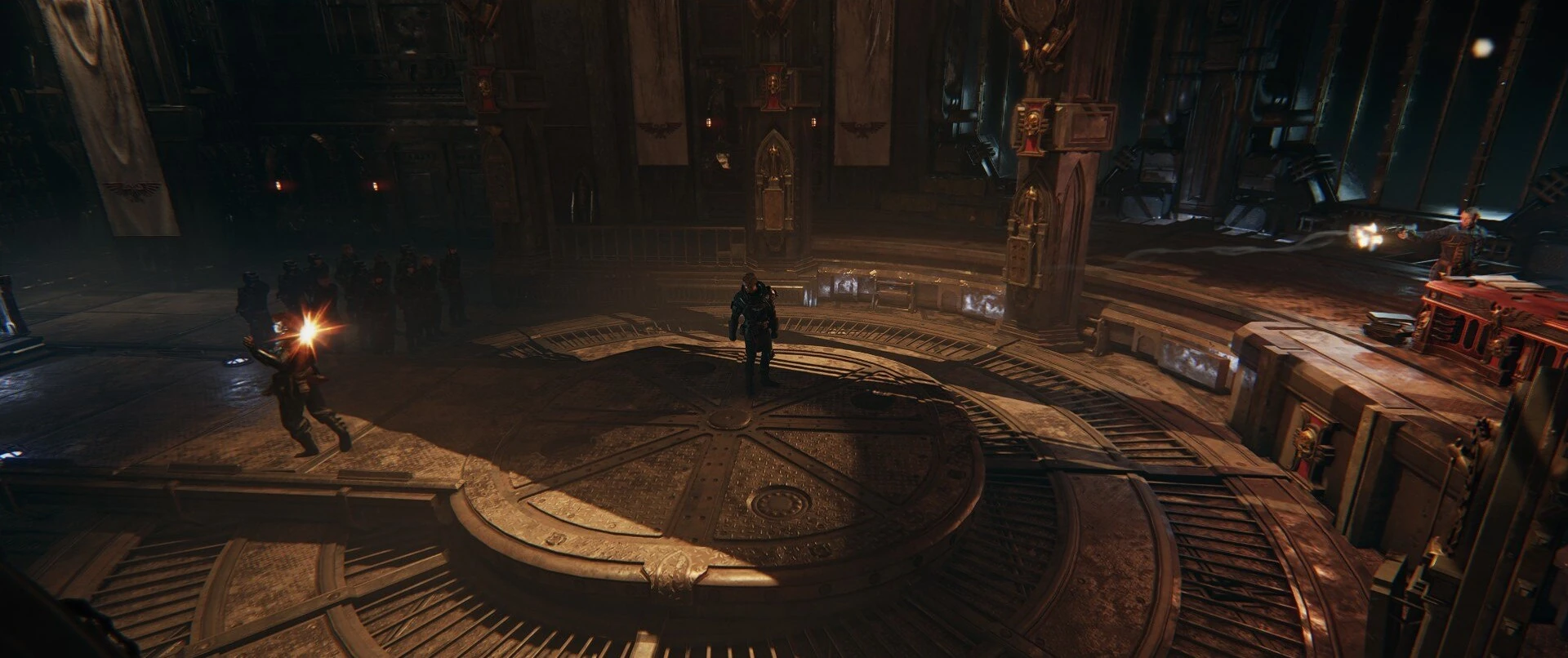 As the player progresses, Mara Vinci continues to work in the shadows. At a certain level, Interrogator Rannick, part of Grendyl's retinue, discovered that someone had been intercepting transmissions from Mourningstar command and relaying them to the surface. Rannick soon discovered the room that Vinci had defiled with Chaos symbols, with Vinci watching from an upper level, but she slipped away before she could be seen. Vinci kept a front of being a loyal soldier during Rannick's investigation, and as the player became more trusted, so did Vinci, both working their way towards becoming true agents of the Inquisition. Outside of the Commissary, Vinci was only spotted sporadically during this time, seen consecrating an autogun at one point, returning from a combat mission alongside other operators at another point, and submitting a lasgun for refinement by tech-priest Hadron Omega-7-7. However, she also killed a soldier of Grendyl's warband, presumably when the soldier caught her in the act of intercepting a transmission. Vinci ended up abandoning the cogitator she was hacking, a data-interrogator still plugged into it, which was later found by the crew. Additionally, sometime later, Vinci was seen appearing visibly ill or shaken, bumping into a guardsman but brushing it off, possibly a sign of Nurgle mutations starting to arise.