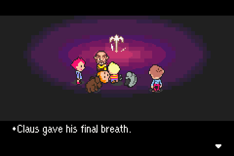 Claus looks at his brother before firing an intense bolt of lightning at him, fully knowing that the Franklin Badge would deflect it back at Claus. Though mortally wounded, he had enough strength to share his final moments with his brother. Claus apologizes and thanks his brother and father for freeing him. Before "going to that place where Mom is", Claus assures Lucas that they will meet again. Claus draws his final breath and dies in his brother's arms.