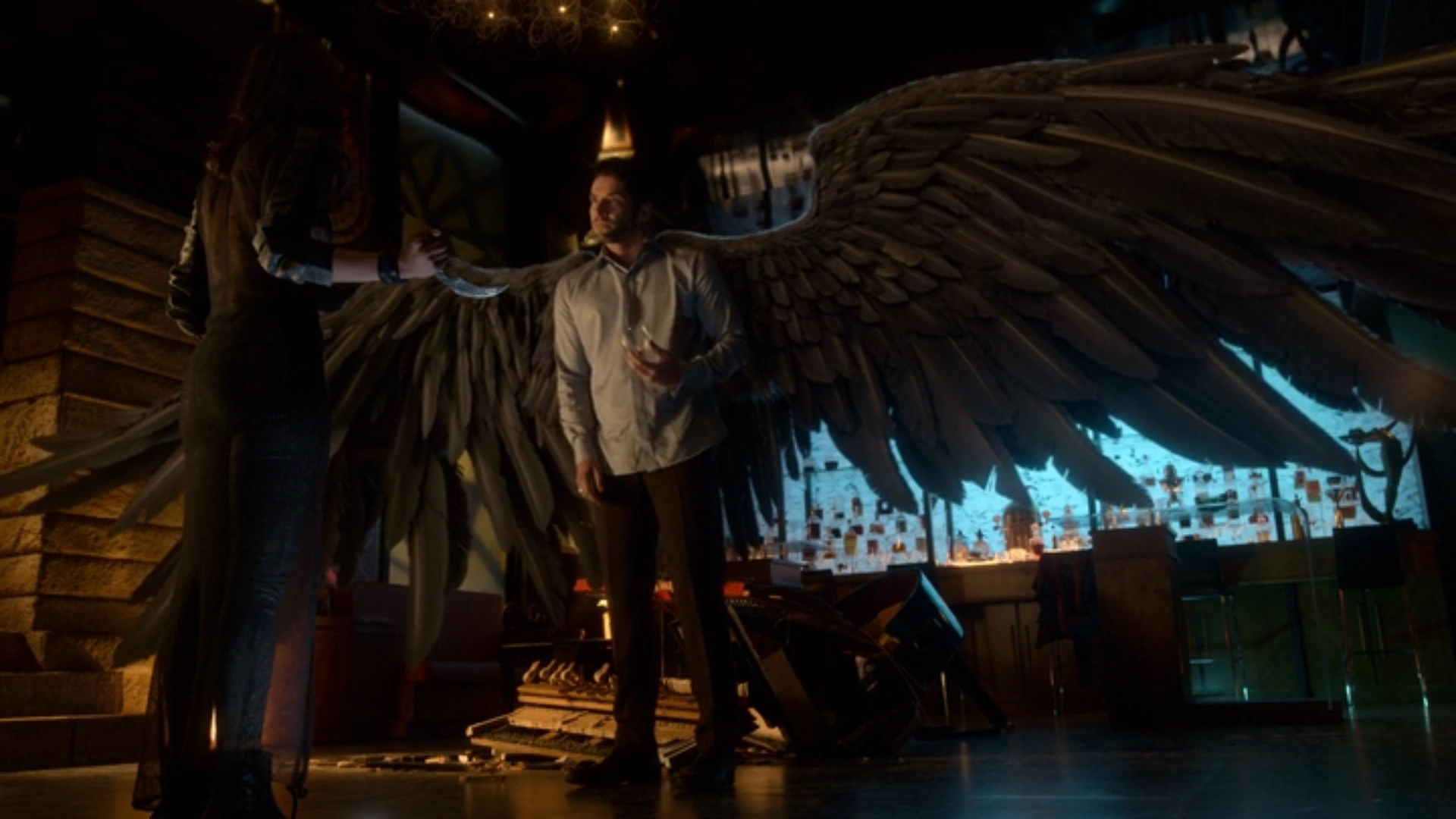 Michael presenting his black angel wings to Mazikeen.