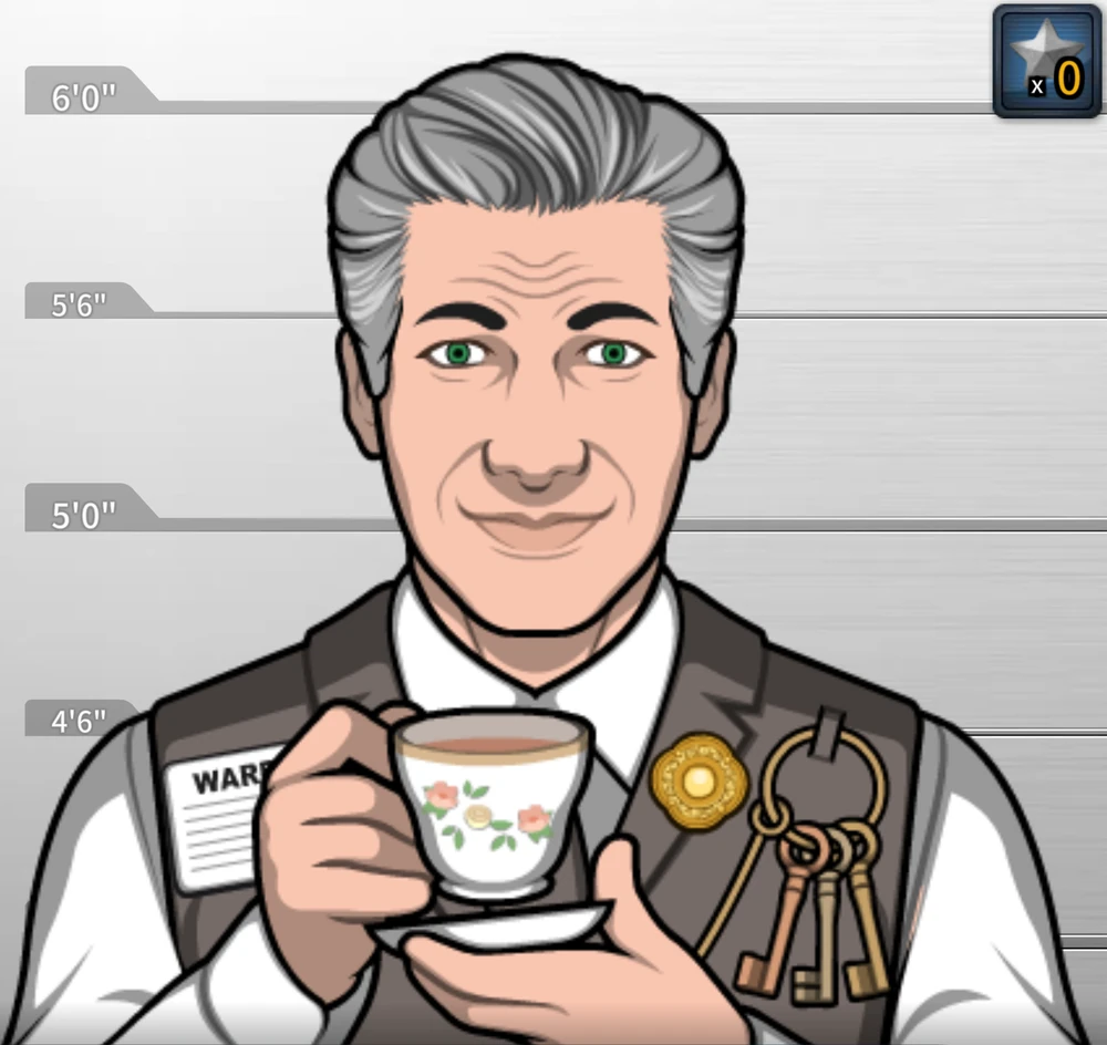 He has noticeable forehead wrinkles and gray hair with white streaks. He's dressed in a gray-brown sleeveless jacket worn over a white suit. On one side of his jacket, he wears a name tag as a warden, while on the other, there are keys. Additionally, he is seen holding the saucer in one hand and a cup of tea in the other.