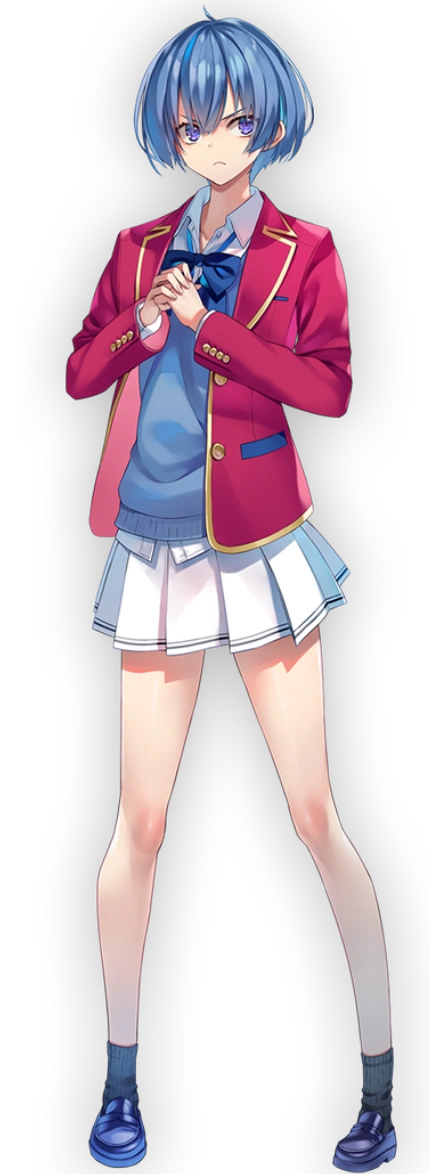 Mio possess a regular height and sports a distinctive hairstyle characterized by short blue hair. Her hair features a single strand that stands upright. Complementing her vibrant hair, Mio's eyes are a captivating shade of purple.