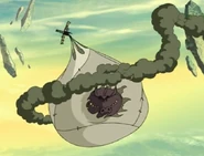 Together, Gwizdo and Lian Chu device a new plan to defeat the dragon. They take the cloaks of the brothers and Lian Chu sows together a giant parachute. Lian Chu enters the bridge to pass as bait for the Mist-Bomber and Gwizdo and Hector manage to trap the beast inside the sack. However, the dragon breaks free and pursues the gyrocopter. To get faster, Hector throws off balast, one thing being a stinking cheese the brothers manufacture in their monastery. After eating the cheese, the Mist-Bomber faints from the bad taste and passes out, crashing into the Isle of Mist.