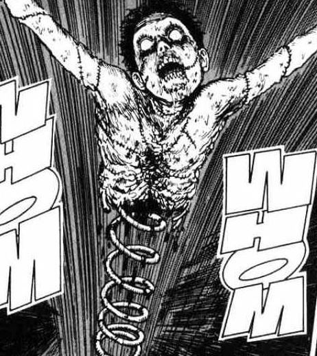 Kirie and Shuichi then go back to the graveyard at night, with Shuichi intending to drive a stake into the heart of Mitsuru's corpse before he can attack Kirie. After digging his grave, Mitsuru's corpse then proceeds to attempt to attack both of them by making large jumps across the graveyard. While doing this, Mitsuru's body continually falls apart, with even his intestines spilling out. When Mitsuru loses both of his legs, Kirie and Shuichi are at first relieved that Mitsuru is gone for god, but Mitsuru then lunges towards them again, and the legs are replaced with a large spring, a suspension spring from the car that ran him over. After failing to attack them, Mitsuru finally dies after falling face first onto the ground, causing the spring to detatch from his body.