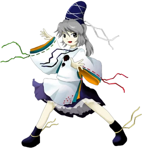 - (Touhou 13) Has grey eyes and light grey hair tied with a long ponytail. Wears a tall dark blue hat decorated with white strings. Wears a white robe with teal and red strings stitched on the edge of the sleeves. She has one large black button and a smaller one underneath on the robe. Has black strings on the collar. She has a teal and gold blouse underneath. Has an indigo skirt with white fluff underneath. Has dark blue shoes with yellow anklets.
