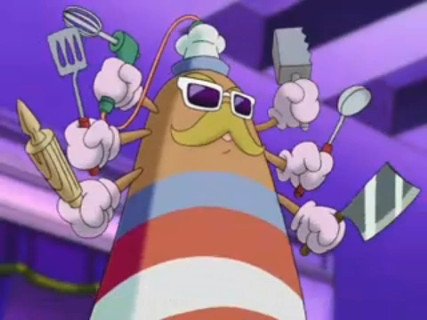 When Goan transforms, he retains his striped French chef's outfit, toque, yellow moustache and eyebrows, and sunglasses, he just grows taller, gets rid of his tie, and grows two extra pairs of extendable arms. In each of his arms, there are six cooking utensils - a mixer, a spatula, a rolling pin, a shaker, a ladle, and a butcher knife. Sometimes, he'll also carry a spherical freezer that he can put anything in to freeze it into ice cream. Goan is also one of the few monsters to be able to talk - when he speaks, he actually speaks in a French language.