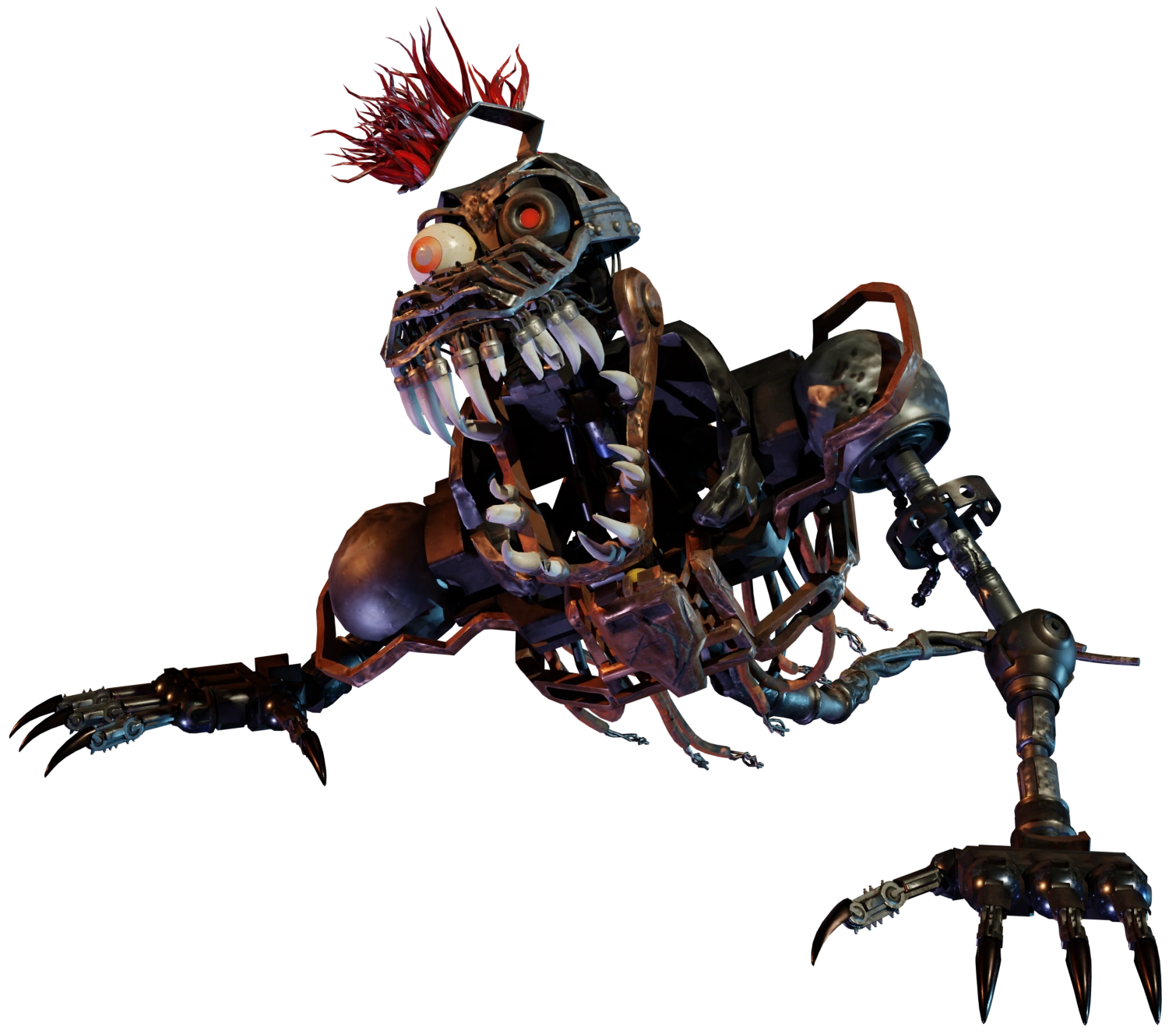 Quite a while after the Pizzaplex was destroyed and abandoned, Monty has degraded to nothing but a rusty endoskeleton with no casing, making him nearly unrecognizable. The bottom of his torso is especially scratched up, likely from dragging himself along the floor. His Mohawk has been reduced to only a few ragged strands of hair, and he has no eyelids, with his left eye being black with a glowing red pupil. His teeth are surprisingly clean, but several of them are broken, dislocated or missing. His lower jaw is a different color than the rest of the body.