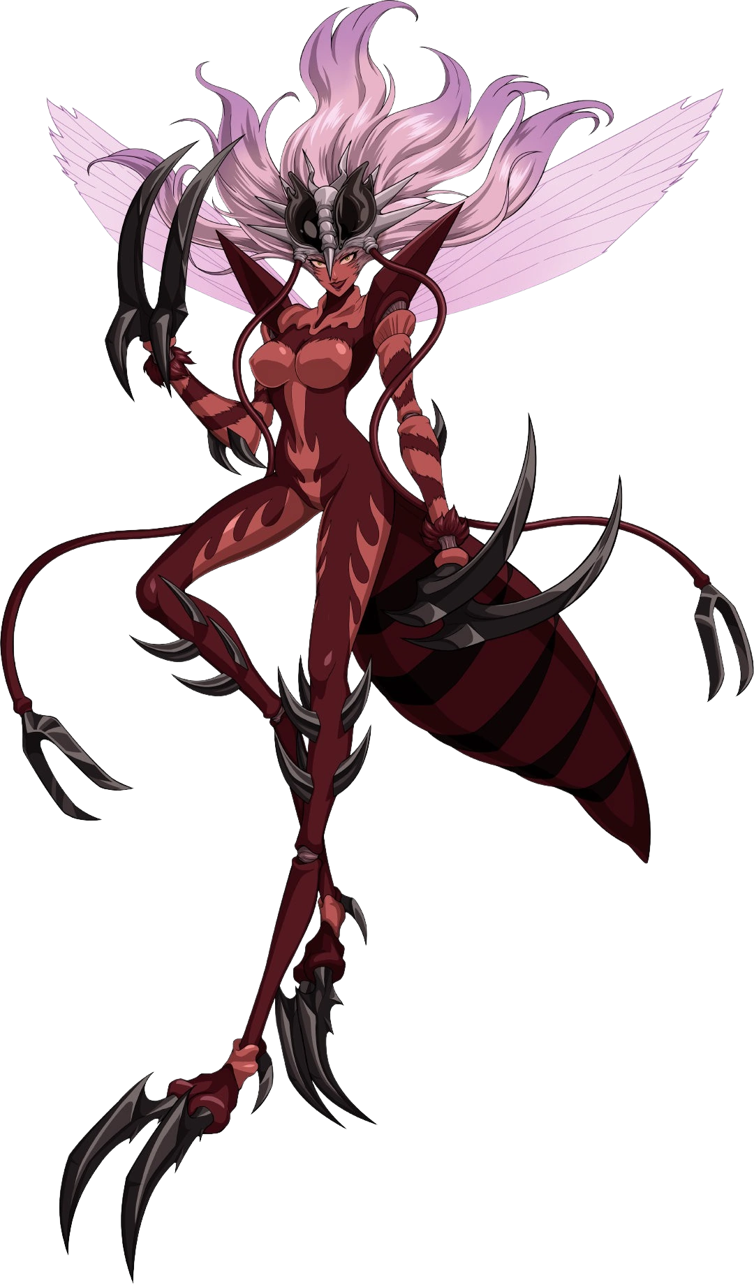 In her transformation form, Mosquito Girl has a dramatic change in appearance. Her skin turns red with the stripes becoming more jagged and turn into spikes; her hair turns pink and stands up completely. Her transformation also allows her to regenerate lost limbs like her legs growing back in her transformation after Genos pulled them out.