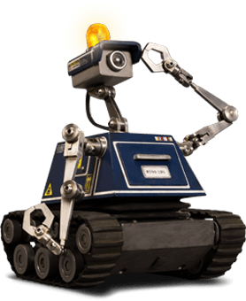 Mugg-1N5 is a robotic sidekick with a security camera head with a dark yellow headlight a blue filing cabinet stomach and a wheel cart movement.