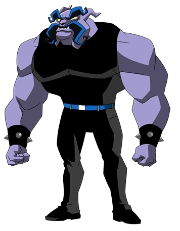 Muggshot appears as a large anthropomorphic bulldog with violet fur, brown eyes and oversized arms which he often uses for walking. He has a blue bowler mustache and uni-brow to match. He mostly wears a white tank top, yellow trousers with red stripes, black shoes and spiked bracelets. During the ACES competition, Muggshot is wearing an aviator's uniform that has been tailored to fit his frame.