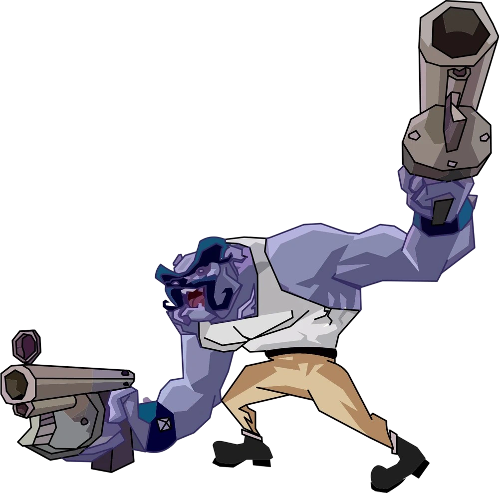 He is an anthropomorphic bulldog and a vicious crime-lord who was once the chief enforcer of the gang known as the Fiendish Five. He maintained a massive gambling empire in Mesa City, Utah, until he was defeated by the master thief, Sly Cooper, who came after the pages of the Thievius Raccoonus which he and his cohorts stole from his family, and then captured by Carmelita Fox. He spent some time imprisoned in Heathrow Penitentiary until, probably after three years or so, he escaped and formed his own flight team called Team Muggshot to compete in the ACES tournament held in Holland, but then he was defeated by Carmelita and apparently imprisoned a second time. Muggshot then escaped a second time and attempted to make off with a gold watch of some value, only to be bested again by the Cooper Gang and captured again.
