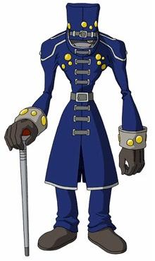 Mummymon is an Ultimate Level Digimon that resembles a mummy. He has a large gun, braces on his legs, claws on his hands and feet, and spikes on his body. He also has a second form of a one-eye gentleman with a cane.