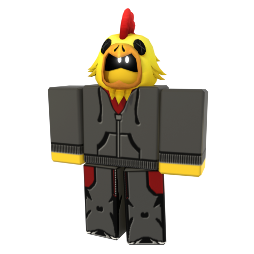 NULL is a yellow Robloxian wearing a grey ROBLOX R suit and a modified version of the Telamon Chicken Suit hat. This hat is also yellow, with feathers jutting out from the sides and the bottom. It also has a long red crest, big black button eyes with dark grey X shapes, and an orange beak with black nose holes. Its face is partially obscured in shadows, with two white glowing eyes peering out from the darkness. NULL also lacks a mouth, but it's unable to be seen due to its lips being sealed shut.