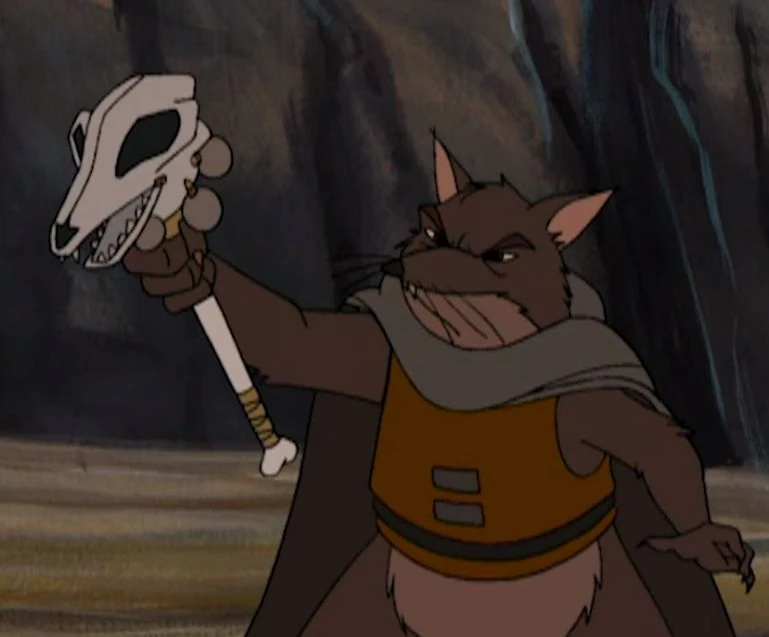 In the books, he is the one who warns Malkariss that his kingdom was being invaded. In both versions, he plays a drum to alert the Blackrobe Rats to prepare for battle.