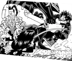 Nomu first appears in Bakugo's Starting Line, after being transported by Kurogiri in the Unforeseen Simulation Joint. He watches the heroes and villains fight each other with Tomura, until Shota Aizawa heads forward to take on Tomura. After being weakened by Tomura's Quirk, Aizawa is later beaten into a bloody pulp by Nomu. Despite his injuries, Aizawa was able to save Tsuyu Asui from being disintegrated by Tomura. Leaving himself open, Izuku Midoriya headed straight towards him to land a punch, but Nomu was able to save Tomura just in time. He then prepared to get rid of Midoriya, until All Might showed up to save the day.