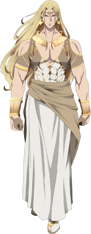 In his original form, he is a tall man with long blonde hair and a muscular body. He wears loose-fitting robes that expose part of his upper body and a loincloth.