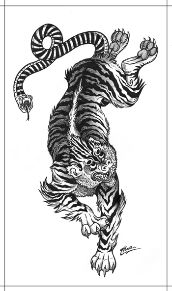 A Nue is a legendary creature found in Japanese folklore. It is described as having the head of a monkey, the body of a raccoon dog, the legs of a tiger, and a snake as a tail. According to the legend, a nue can metamorphose into a black cloud and fly. Due to its appearance, it is sometimes referred to as a Japanese chimera. Nue are supposed to be bringers of misfortune and illness.
