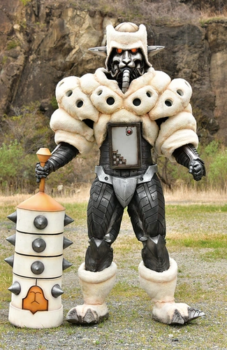 Odordo Maxioff's head is a white robotic alpaca head with orange eyes, his body has white alpaca wool with holes on it, his Gangler safe is on his belly, his grey arms and legs are robotic like, he also has white alpaca feet, his weapon is the Alpakanabo a White kanabō with an alpaca's orange mouth on the middle.