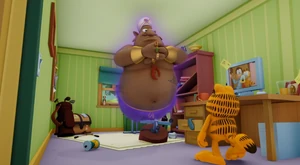 Garfield and Odie, desperate, go back upstairs to review that article where it was written how to stop an evil genie and they discover that they have to make them say his name backwards and then they will have a wish.