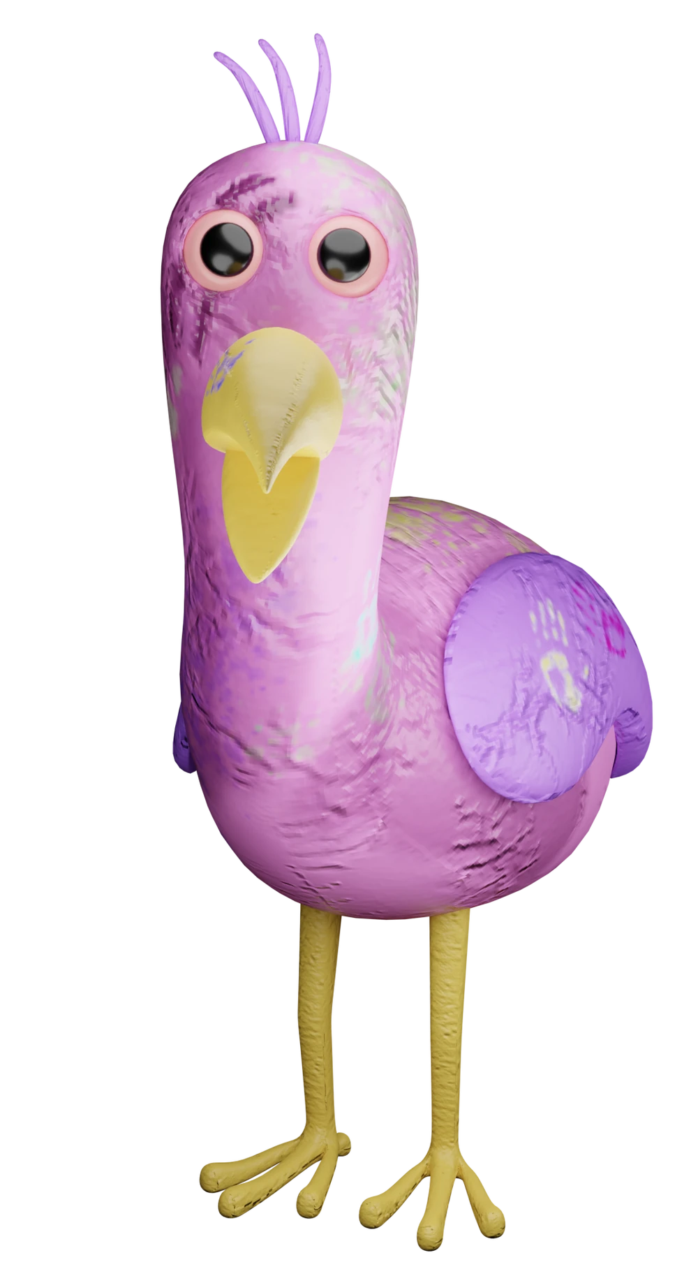 Opila Bird is a large bird-like creature with a pink body and purple wings. Three purple feathers protrude from her head, and her eyes are a bloodshot red. Her legs and beak are yellow, the latter of which having been described in case notes as sharp. Handprints of various colors can be found along her body.