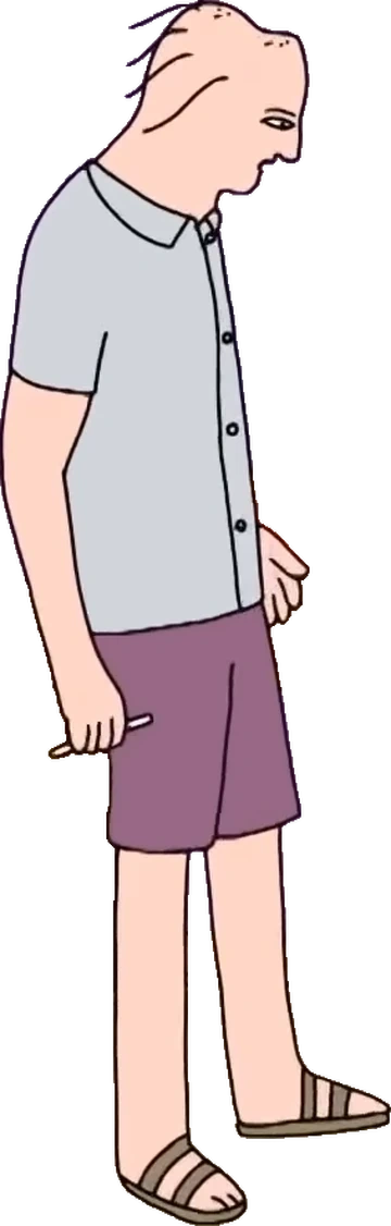 He is a tall, Caucasian human male with a misshapen, dented, wrinkly head and a large, bumpy nose. He has wispy strands of hair emerging from his mostly bald head, and he has bushy, brown eyebrows.