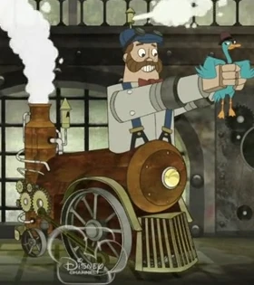He looks similar to his counterpart, except he has a handlebar mustache, and his lower half is a steam engine locomotive. He has difficulty in telling different objects apart. For example, he mistakes von Doofenshmirtz's nemesis Swerry the Swan for a cucumber, and also mistakes his daughter Vanessa Von Doofenshmirtz for a 1903 Danville World's Fair commemorative coin.