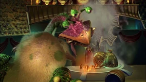 He and his friends fill up Poultra's water dish with Purple Flurp and tricked her into drinking it. Once she did, she exploded (getting rid of Sam's hair piece in the process).
