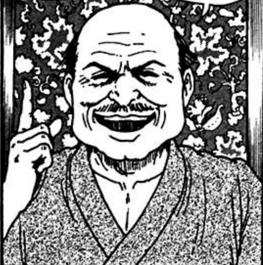 Mineishi is a balding elderly man with a square chin and a moustache.