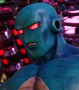 As Prometheus, he transforms into a blue and gray humanoid creator, with blue wings, sliver bracelets, his boots, and red eyes.