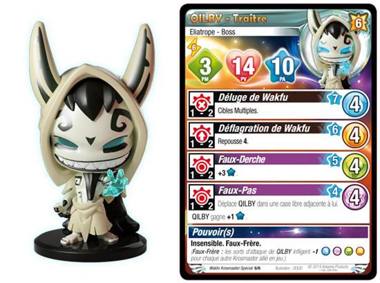 Qilby appears as an infinite card with which he can be summoned on the board, having three phases with which to attack his opponents: the first is his normal form, he can only defend himself by hitting with his wooden staff, the second is his lobotomized form but with his eliacube shoulder pad, with which he will attack using his arm made of wakfu, and the third is the same as the previous one. only without his shoulder pad.