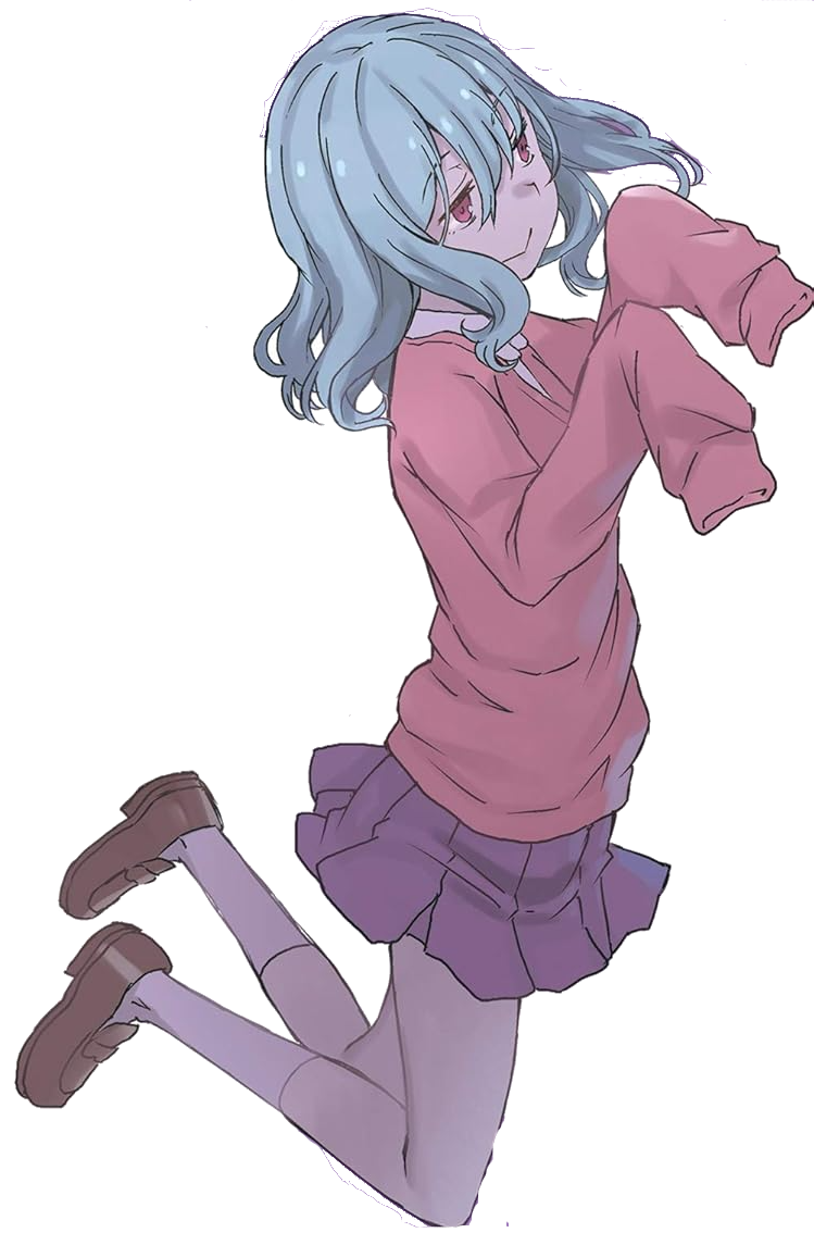 Raifu is a young girl around the age of 14 who has light teal-colored short hair and red eyes. She normally wears a pink sweater with long sleeves and a purple miniskirt.