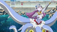 As Calmaramon, she is from beautiful to ugly. Her upper body portion of herself resembles a wicked sea witch. Her squid figure portion of her body is white and blue with red stripes, along with her tentacles, and 10 yellow eyes.