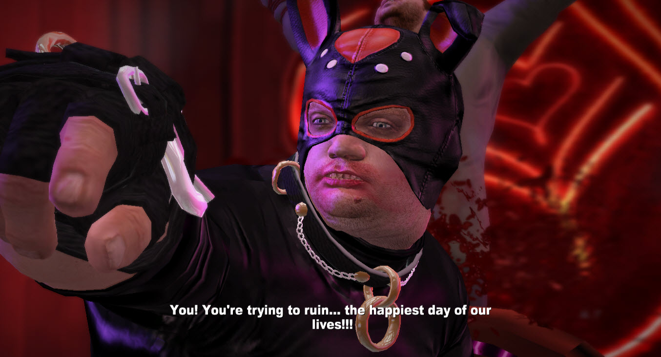 He is an obese, porn-addicted sex maniac, wearing an S&M black leather outfit and wielding a giant chainsaw in his hands, who uses the zombie outbreak as the perfect opportunity to "marry" any unfortunate female survivor he can find and perform with her sexual intercourse to lose his virginity.