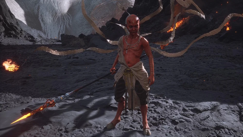 Sun Wukong along with his brother Zhu Bajie, encounter and fight Red Boy once more. Red Boy, feeling outmatched, unleashes his most powerful sorcery yet: Samadhi Fire (三昧眞火). Sun Wukong asks for some rain from the Eastern Dragon King to counter Red Boy's Samadhi Fire, to no avail as but Red Boy's fire is inextinguishable to normal efforts to quench fire with the rain in fact intensifying the flames. Caught directly by the flames, Sun Wukong is ultimately almost burned to death by the flames and he finally resorts to asking for the help of the Bodhisattva Guanyin, and lured the Red Boy out of his cave. As Red Boy is fighting Wukong in a forest, he found Guanyin's empty lotus throne, thus he sat in it, imitating Guanyin's posture. Suddenly the lotus throne transformed into swords, which pierced and wounded him. Worse, when he tried to take them out, they then transformed into halberds, which trapped him. In pain, Red Boy then pleaded for Guanyin to release him, with the exchange of him being Guanyin's permanent disciple, and was given the name 'Shancai' (善財).