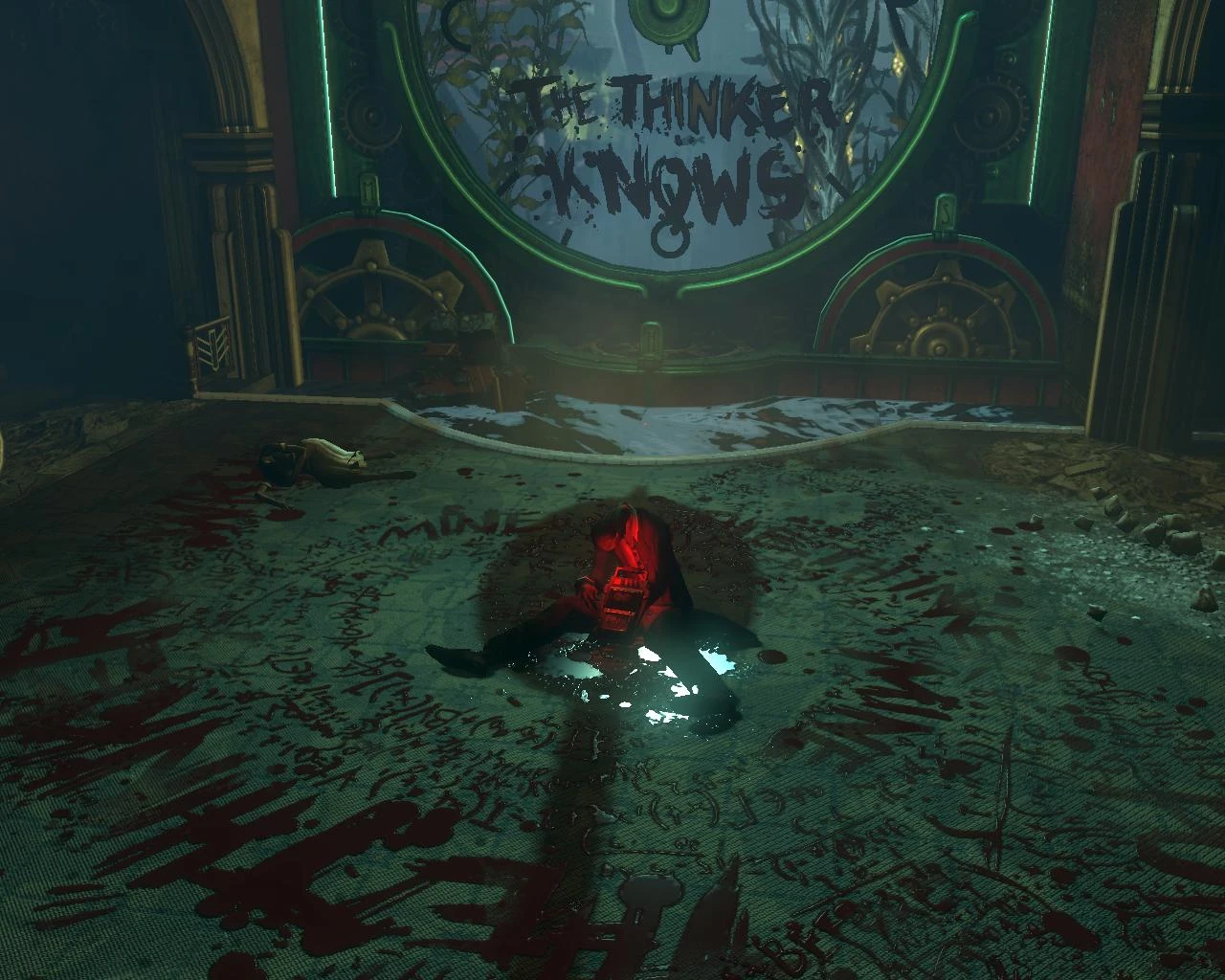 Throughout this time, Wahl had begun indulging in ADAM like many other citizens in Rapture. Specifically, Wahl had been taking Brain Boost gene tonics to enhance his overall intelligence to help him collaborate with the Thinker better. However, this has resulted in Wahl suffering from insomnia, memory loss and his sanity slipping overall. It is within this time that he becomes entirely focused on one of his previous theories: that the Thinker can provide a "predictive equation" that can foretell any events that could ever happen and sought to crack the equation. He scrawled equations all over Minerva's Den with paint and eventually blood in hopes of solving it. Wahl's splicing and efforts to solve the predictive equation inevitably drove him insane. Completely obsessed with the power he has over the Thinker and paranoid that Porter may come back, Wahl cuts off Minerva's Den from the rest of Rapture at an unknown point in time so that no one can take the Thinker away from him.