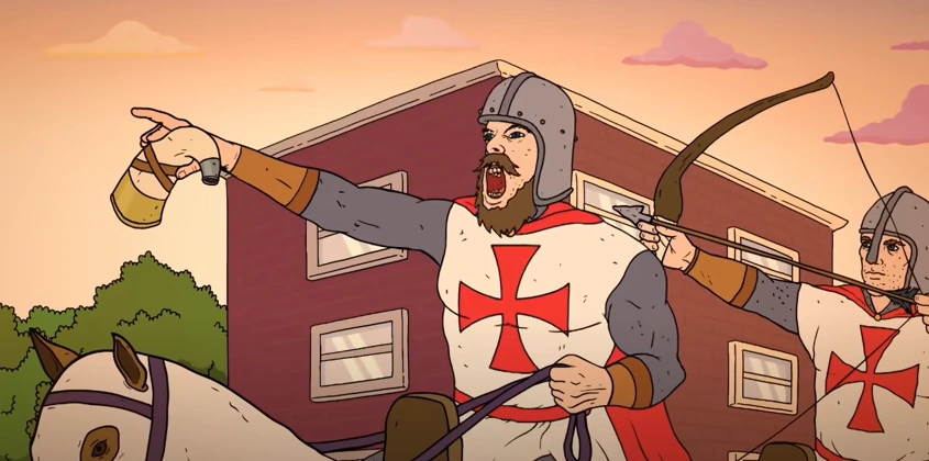 Each member is a Caucasian male wearing grey, chainmail armor, a red cape, and a white mantle with a red cross. They all ride white horses with saddles.
