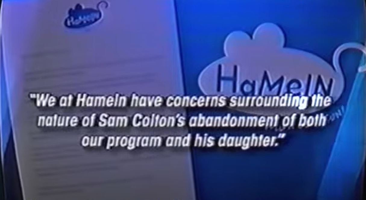 When the unnamed director of Hameln Entertainment was running tests onto Amanda, teaching her to say words (presumably the names of demons such as Balaam, Paimon, and Balam) and transformed her into becoming possessed by a demon into the show itself, Sam Colton had mysteriously disappeared when he confronted him. After Sam Colton’s mysterious disappearance, as shown in a news report as a video tape, the Representatives released a public statement over the news denying being aware of the circumstances surrounding Sam’s disappearance, claiming he abandoned Rebecca and that Hameln were going to cancel any public appearances involving her.