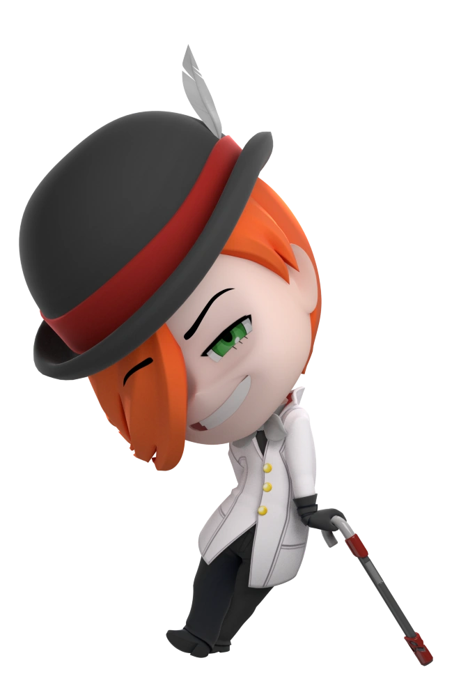 He wears a bowler hat with a grey feather and a red stripe on it, as well as a red-lined white and grey suit with golden buttons and a grey scarf. He also wears grey gloves and pants, with black shoes.