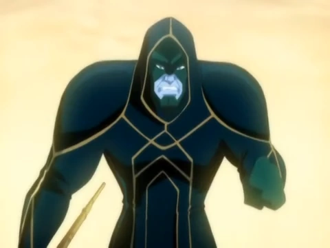 Ronan has blue skin and wears a heavy, green exoskeleton battle armor, and a blue cloak with yellow strips.