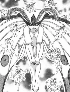 Giving her friend all her belongs but a stone later revealed to be Behelit, she headed to the valley. Once the search parties found her, her furious father struck her for his attempt before attacking her intervening mother. With said behavior outlawed in her "paradise", she activated the stone, sacrificed her parents, and was reborn into a Apostle. Even since, her actions were mostly limited to kidnapping children to transform them into other "elves" and turning unlucky and lost adults in the forest into her personal guard.