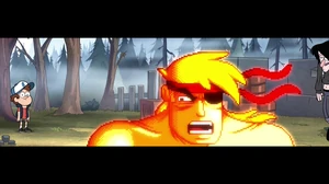Dipper chases after him and a scared Robbie in an attempt to explain the situation to the videogame character, he finally corners it in the same place he was going to fight Robbie, just before Rumble delivers the finishing blow, Dipper intervenes and admits he had lie to Rumble, knowing that this would mean that he would have to fight him instead. Rumble feels betrayed and dishonored so he challenges Dipper instead, Dipper accepts, even after being told by Soos not to do it as he would get sacked easily. Rumble unleashes a series of videogame themed attacks, Dipper dodges most and even counters at some times but the videogame fighter proves too much for him and ends up getting trashed in a Super Power Ninja Turbo Neo Ultra Hyper Mega Multi Alpha Meta Extra Uber Prefix Combo. After Rumble won, he finished off with his catchphrase, "Winners don't lose!" Dipper told him not to bet on it because as soon as he was over with his mission, the mandatory endgame GAME OVER screen appeared, which scared him. He grieved his last as he was erased from reality.